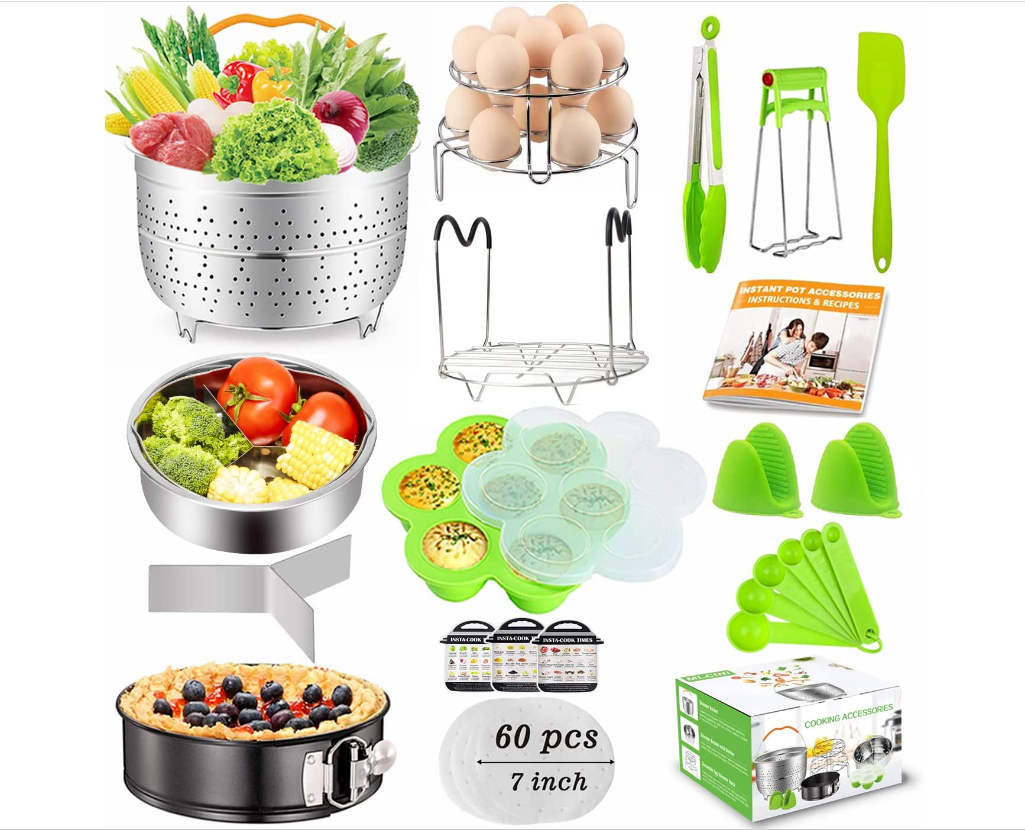 • ★[21 Pcs Instant pot accessories] Pressure cooker acessories provide all you needs for delicious foods. It includes 1 Large capacity steamer basket, 1 Springform Pan, 1 Steamer basket with divider, 1 Egg Bites Mold, 1 Stackable Egg Steamer Rack , 1 Steamer Rack Trivet with Heat Resistant Handles, 1 kitchen Tong, 1 Silicone Spatula, 2 Oven Mitts,3 Magnetic Cheat Sheets,1 CookBook(Instruction & Recipes), 6 in 1 Measuring Spoons,1 Gift Box,1*60 Pcs Parchment Steamer Papers Liners