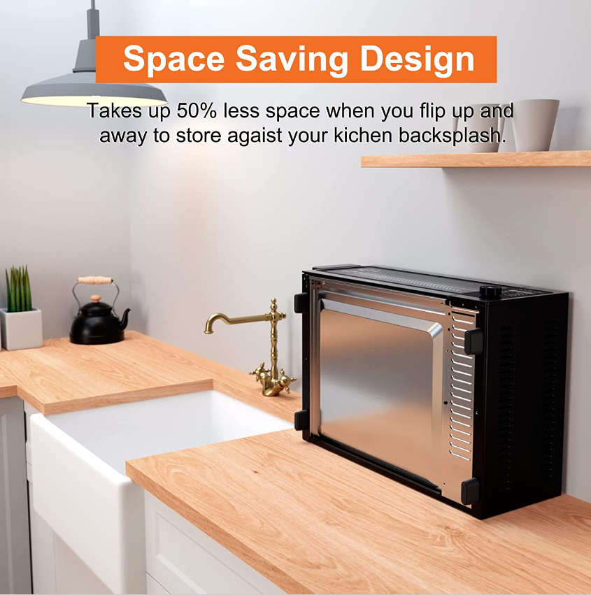 • ?LARGE CAPACITY & SPACE SAVER: This toaster ovens countertop is big enough for up to 9 slices bread, 12” pizza. 2 rack positions for improved cooking flexibility and accommodating a variety of foods. Spacious interior, compact form factor without taking up too much counter space. Takes up 50% less space when you flip it up and away to store against your kitchen backsplash.