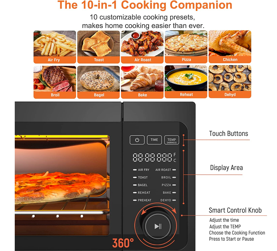 • ?10 PRESET FUNCTIONS: This versatile Fabuletta air fryer oven is programmed with 10 preset cooking functions, preheat, air fry, pizza, air roast, toast, bagel, bake, broil, dehydrate, reheat. Guiding and giving you plenty of ways to make easy and delicious meals and snacks.