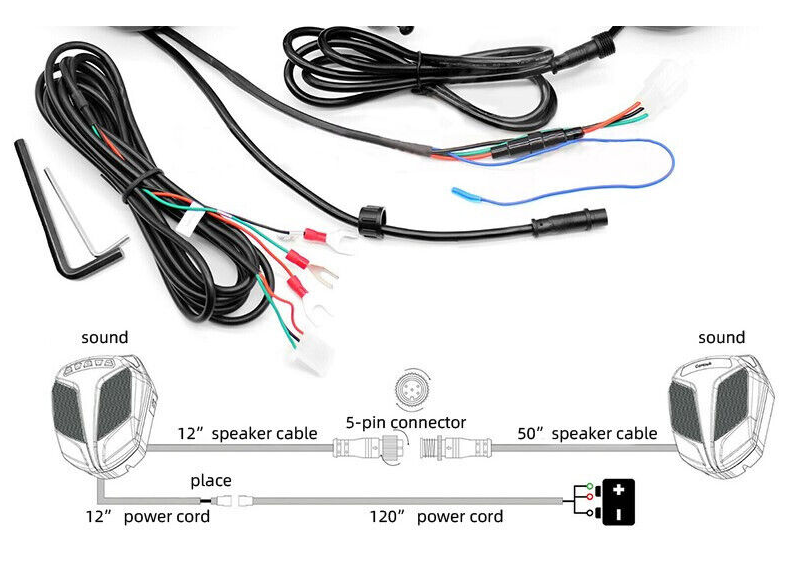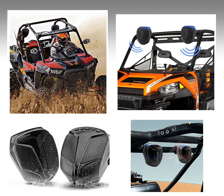 1. Speaker Dimension: 5" W x 6-1/4" L x 5-3/4" H. 2. Built-in amplifier. No additional amplifier is needed. Features: 1) Built-in Bluetooth 4.0 Receiver 2) USB Input(USB drive) 3) microSD Slot 4) Built-in FM Radio 5) White / Blue LEDs Effect Specifications of the band FM: Cover: 87 - 108 (± 0.55MHz) Sensitivity: ≤11dB Distortion: ≤0.5% SNR: ≥60dB Amplifier Specifications: Input Voltage: DC 10-16 V Input Sensitivity: 100MV-3000MV Rated Input Power: 2 x 20W Peak Power: 180W Channel: 2.0 Wireless transmission range > 15m Response Frequency: 20Hz-20KHz S/N: >80dB USB: Support USB Drive in mp3 format USB Charging: No Speaker Specification: Color: Black LEDs Color: White / Blue Plug and Play Speaker Core: 4" Speaker Housing Material: ABS Connector: 5-pin connector Cable length: 50" (Slave speaker) 1-1/2" to 2" Roll Bar Mounting Dimensions: 5 W x 6-1/4 L x 5-3/4 H (in.) Package Included: 1 x Master Speaker 1 x Slave Speaker 1 x Power cord 2 x Roll-cage Bar Mounting Clamp 1 x User Manual All-in-One 2 Channel 180W Peak Built-in Amplifier ATV UTV Waterproof Bluetooth Stereo Speakers System with 4" Full Range High-Performance Speaker Core. Included Heavy Duty Roll-cage Bar Mounting Clamp supports 1.5 to 2" bar size. Also fits certain motorcycle engine crash bar. FM Radio Receiver Built in. Support USB and microSD Card MP3 files. Support USB Charging. Blue and White LEDs Light Effect. Perfect for Can-Am ATV UTV Pioneer Polaris RZR Wolverine Yamaha YXZ Kawasaki Mule 4 Wheeler Jeep GoKart Golf Cart Electric Bike Marine Boat. Overall 5" Width Matte Black Speaker Housing with Glossy Black "T" Style Mesh Screen. Waterproof Design. Built with High-Quality ABS Material. 50" Long Speaker Cable(Slave speaker). 120" Long Power Cord for Easy Custom Installation. Bluetooth 5.0 Wireless: Stream your favorite music and radio channel from your smartphone. Compatible with iPhone 4 / 5 / 6 / 7 / 8 / X / XR / XS Max, iPod, Samsung Android Galaxy S Note Series and any smartphone devices. Support Bluetooth Wireless connection up to 15 meters. Superb Crystal Sound Quality. Advanced IP56 Waterproof Design. Great for outdoor use. Easy Installation: Comes with all necessary hardware and wiring. Plug and Play. Standard 12V Power Connection. |