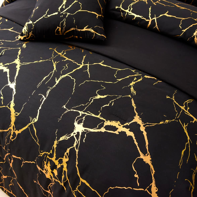Gold Metallic Marble Comforter and Sheet Set 7Pcs King Size Bed-In-A-Bag Glitter Bedding Sets (Black, King)