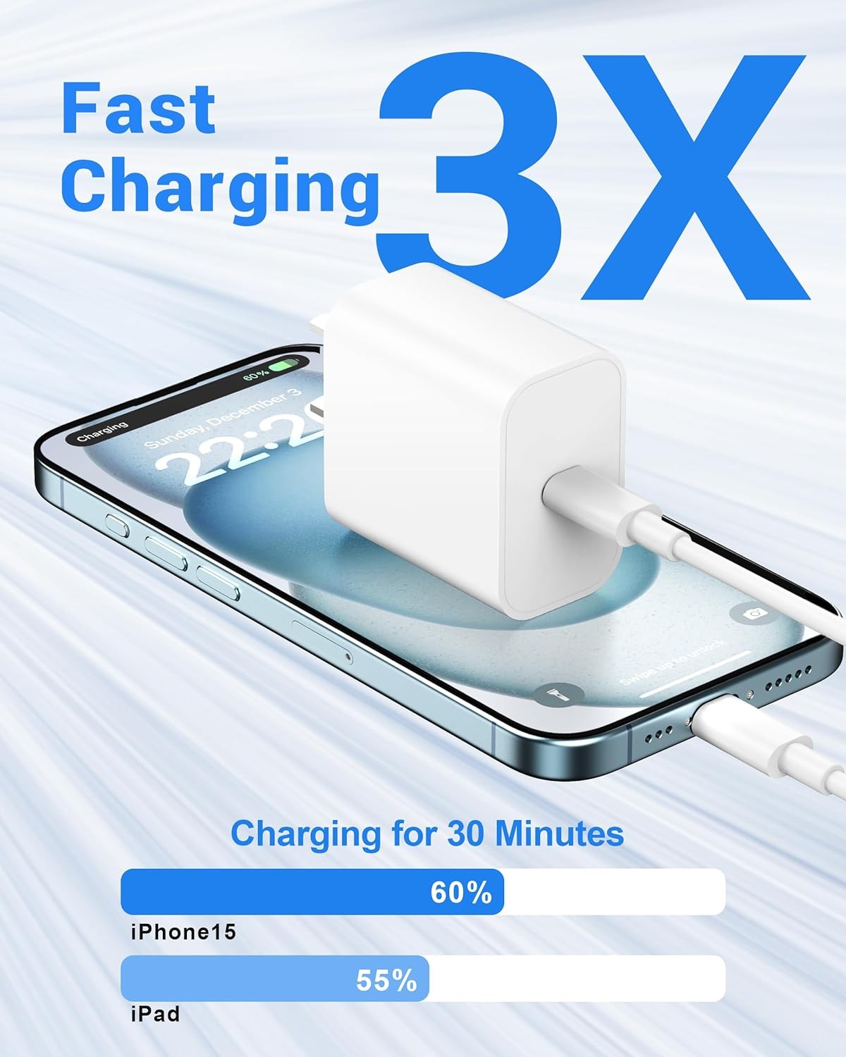 【for iPhone 15 / iPad Fast Charger USB C】 With the 20W PD USB C Charger Block and 10FT long USB C to C cable, which can reach up to 3X faster than the standard 5W charger. You can full charge the iPad Pro 12.9 in about 2.5 hours.