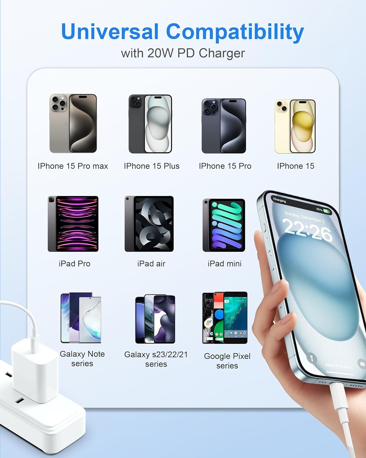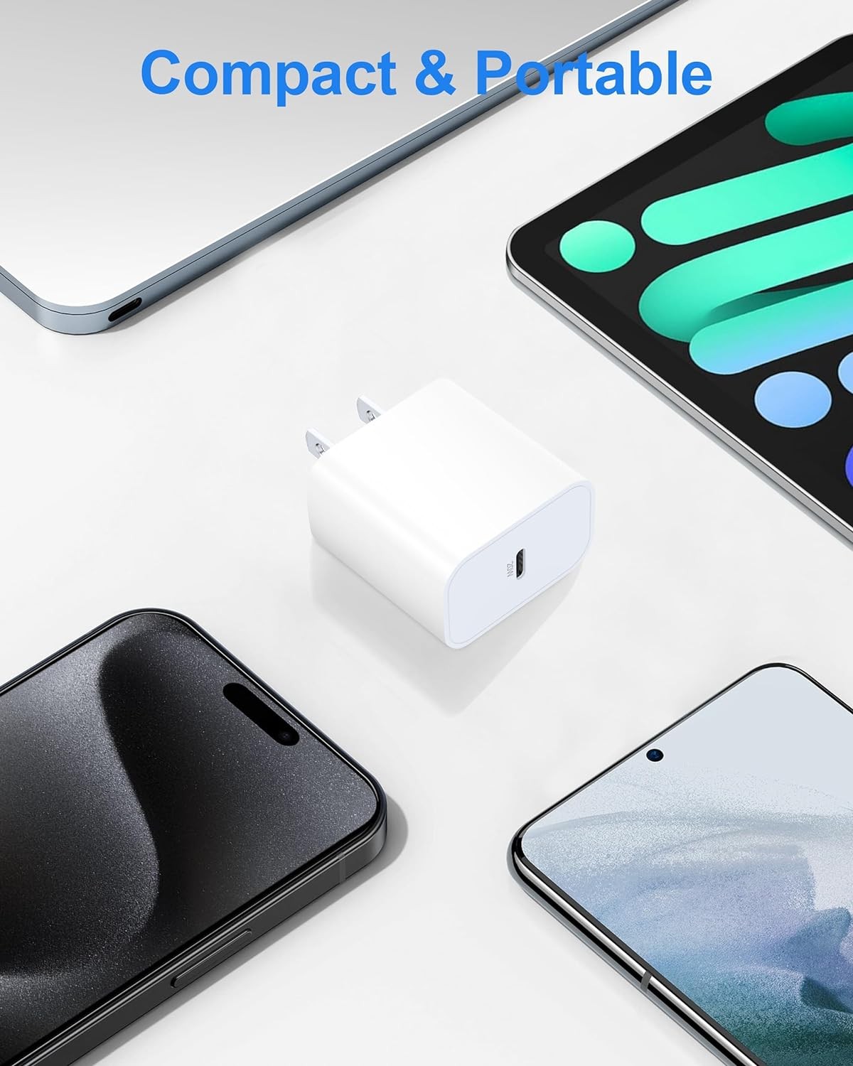 【Universal Compatibility】 20W USB C Fast Charger Compatible with most USB-C devices, including for iPhone 15/15 Plus/Pro Max, iPad Pro 12.9 inch 6th/5th/4th/3th (2022/2021/2020/2018), iPad Pro 11 inch 4th/3th/2th/1th (2022/2021/2020/2018), iPad Air 5th (2022), iPad Air 4th (2020), iPad Mini 6th Gen (2021), iPad 10th Generation 10.9 inch (2022); Also compatible with Google Pixel 7/6/5/4/3/2/XL, and more USB C android phones.