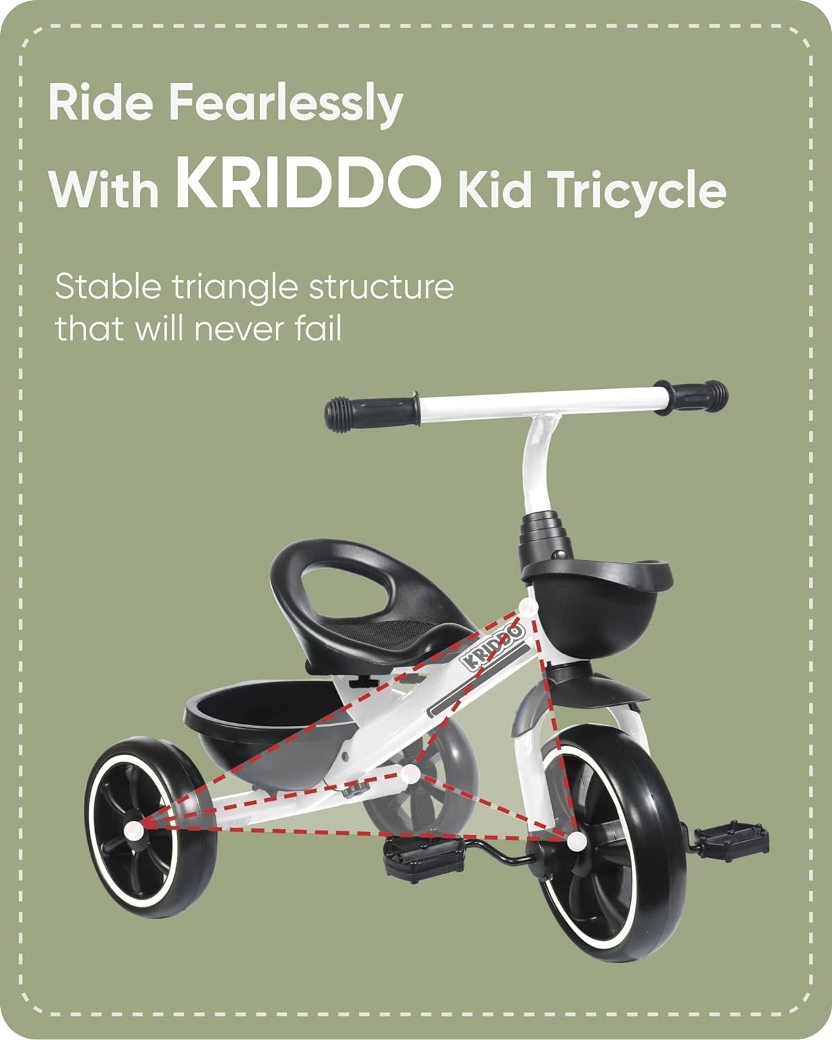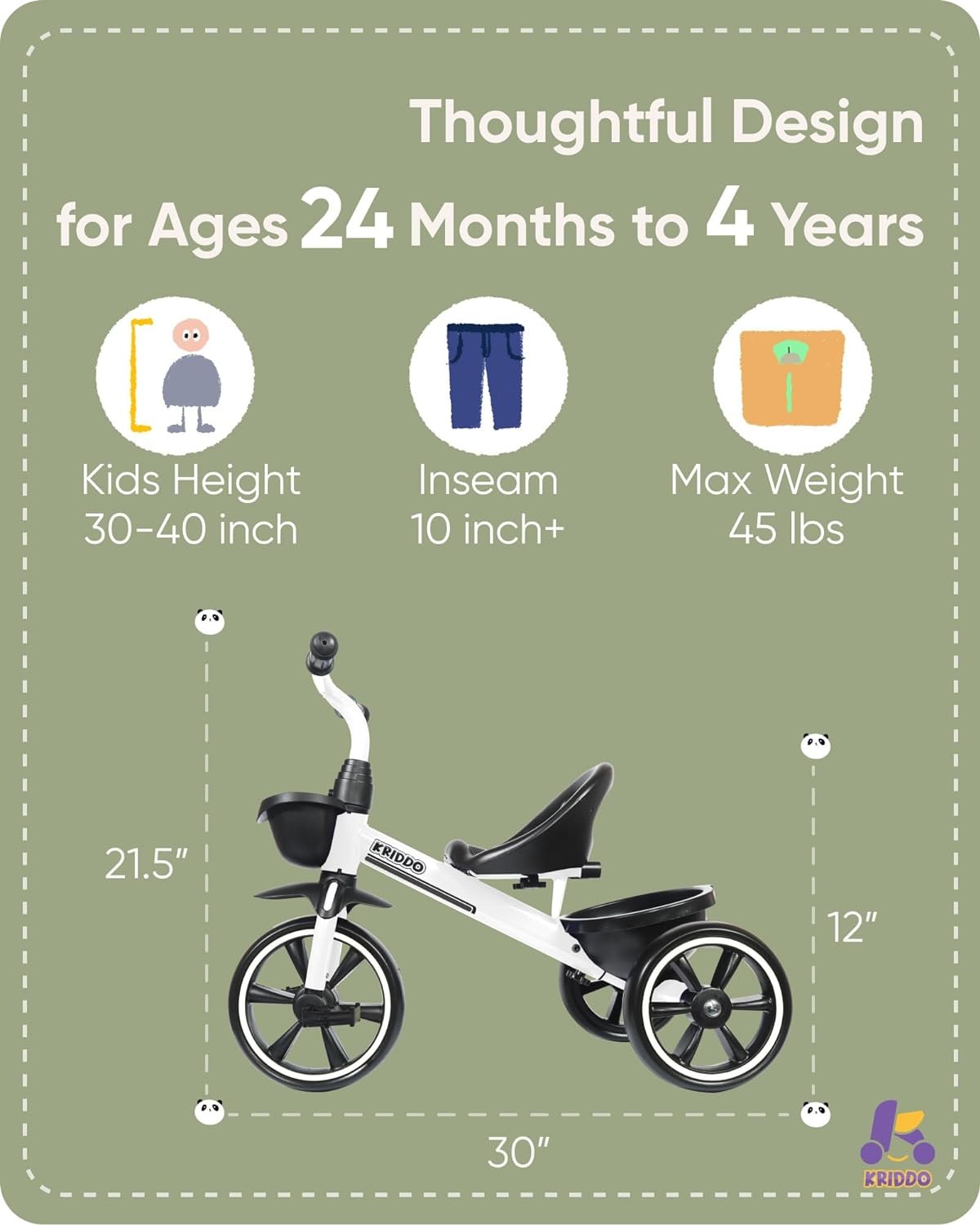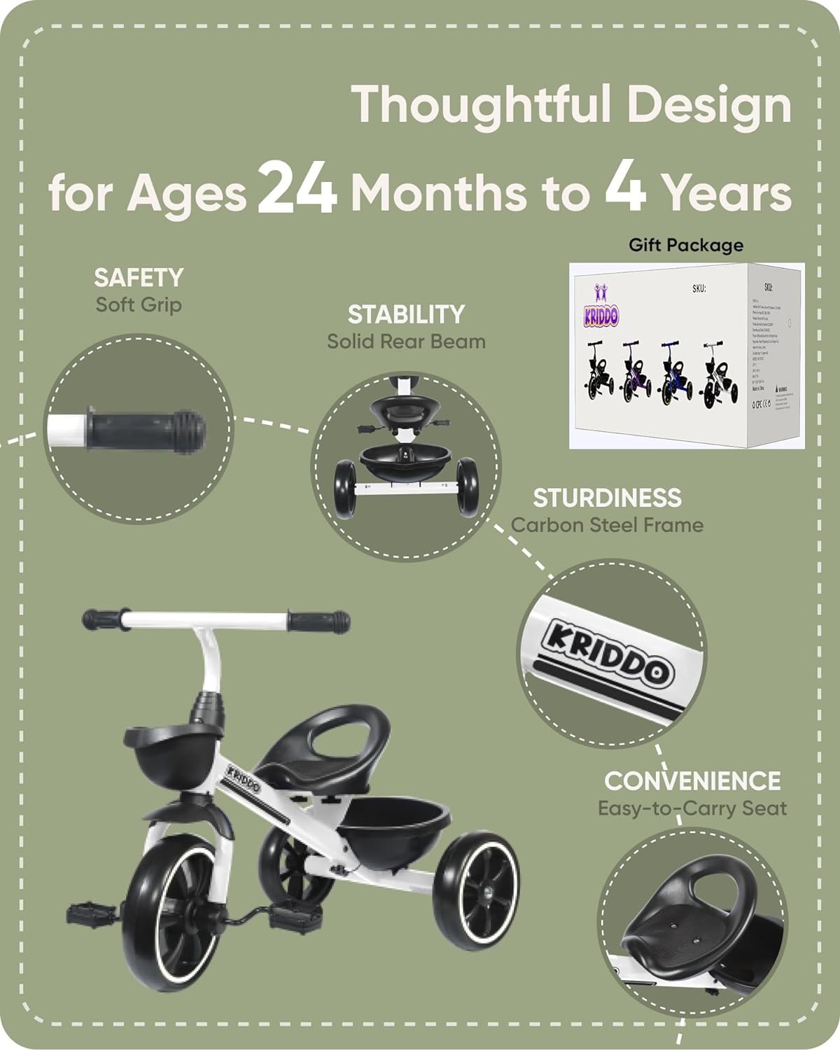 TODDLER TRICYCLE – KRIDDO kids tricycle is designed for 24-48 month toddler girls & boys who are curious and exited to explore the world, it helps to develop kids' steering skills, steering and coordination at an early age. KRIDDO kids trike for 2 year old let your kids enjoy riding and gain confidence, as well as develop muscle strength, it’s a fun gift for your little ones.