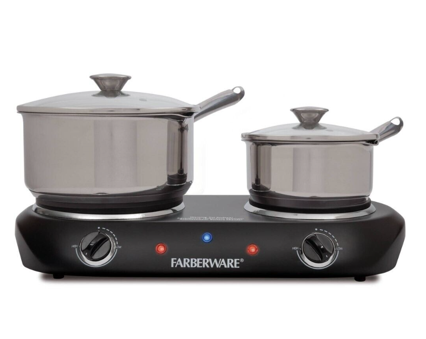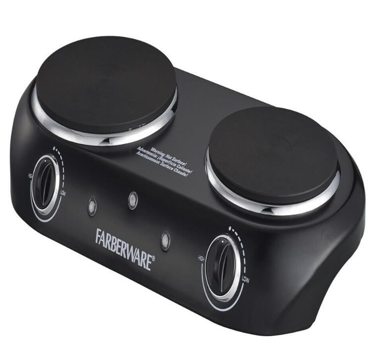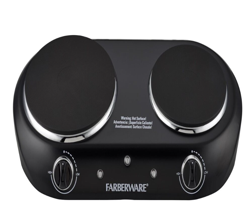 Expand your culinary horizons and kitchen capabilities when you bring home the Farberware Black 1800 Watt Double Burner Electric Cooktop. This compact unit is the ideal selection for cooks that don't have a full cooktop or need additional cooking space. Designed with two burners with dual controls to adjust temperatures as needed, the cooktop will allow you to easily prepare two dishes at once. You can simmer chicken on one side and boil rice on the other! The Power light will let you know when the cooktop is on, while the Ready light will let you know when the desired temperature is reached. Die-cast plates will allow for more even distribution of heat for better cooking, while back bumpers and rubber feet will keep the cooktop safely in place away from cupboards and walls. The cooktop is lightweight, allowing you to store it with ease or take it with you wherever you go. Whether you are a kitchen pro or are still learning the basics, the Farberware 1800 Watt Double Burner Electric Cooktop is sure to become a fast favorite! Farberware Double Burner Electric Cooktop expands your at-home kitchen capabilities. User-friendly design is suitable for beginners as well as pros. Dual burners allow for preparation of two different dishes or meal components at once. Durable die-cast plates heat consistently for even cookingPower light clearly indicates when the unit is on while Ready light indicates when the desired temperature is reached. Rubber feet provide stability, keeping the unit in place, while back bumpers provide safety, keeping the unit away from walls. Lightweight construction facilitates convenient portability |