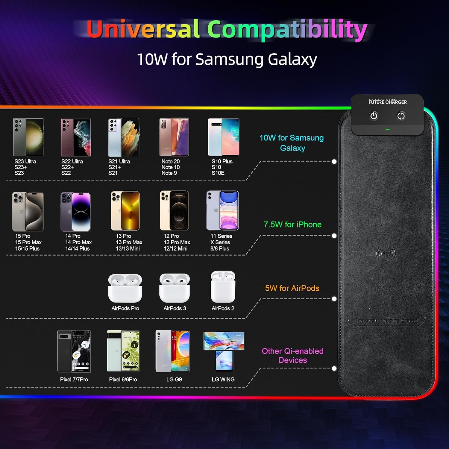 【10W Wireless Charging RGB Gaming Mouse Pad】: The RGB Gaming Mouse Pad design with 10W fast wireless charging which is compatible with iPhone 15/14/13/12/11/X/8 Series, Samsung Galaxy S23/S22/S21/S20/S10/Note 9/Note 8, Airpods 3rd/Airpods Pro 2nd/Airpods Pro/Airpods and other devices. So can charge your phone or Airpods when you use the large mouse pad whether you are gaming or working.(NOTE: 10W fast charging need power adapter 9V 2A or other QC3.0/2.0 adapter,the ADAPTER IS NOT INCLUDED)