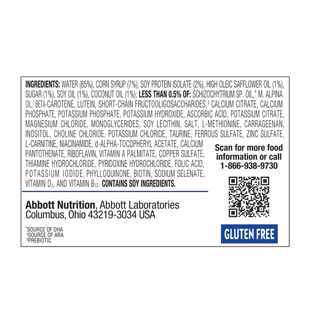 WATER (85%), CORN SYRUP (7%), SOY PROTEIN ISOLATE (2%), HIGH OLEIC SAFFLOWER OIL (1%), SUGAR (1%), SOY OIL (1%), COCONUT OIL (1%); LESS THAN 0.5% OF: SCHIZOCHYTRIUM SP. OIL*, M. ALPINA OIL†, BETA-CAROTENE, LUTEIN, SHORT-CHAIN FRUCTOOLIGOSACCHARIDES‡, CALCIUM CITRATE, CALCIUM PHOSPHATE, POTASSIUM PHOSPHATE, POTASSIUM HYDROXIDE, ASCORBIC ACID, POTASSIUM CITRATE, MAGNESIUM CHLORIDE, MONOGLYCERIDES, SOY LECITHIN, SALT, L-METHIONINE, CARRAGEENAN, INOSITOL, CHOLINE CHLORIDE, POTASSIUM CHLORIDE, TAURINE, FERROUS SULFATE, ZINC SULFATE, L-CARNITINE, NIACINAMIDE, d-ALPHA-TOCOPHERYL ACETATE, CALCIUM PANTOTHENATE, RIBOFLAVIN, VITAMIN A PALMITATE, COPPER SULFATE, THIAMINE HYDROCHLORIDE, PYRIDOXINE HYDROCHLORIDE, FOLIC ACID, POTASSIUM IODIDE, PHYLLOQUINONE, BIOTIN, SODIUM SELENATE, VITAMIN D3, AND VITAMIN B12.CONTAINS SOY INGREDIENTS.