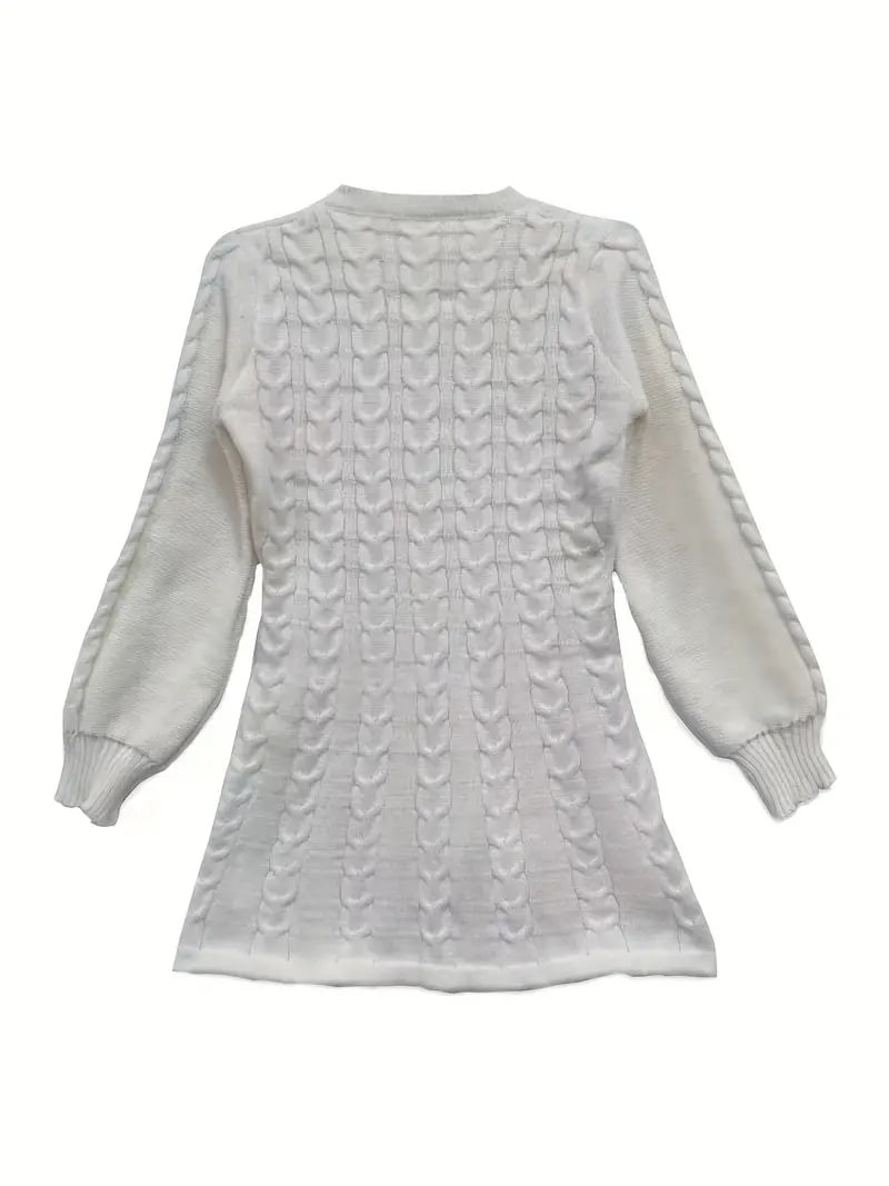 Solid Cable Knit Dress, Elegant V Neck Lantern Long Sleeve Dress, Women's Clothing