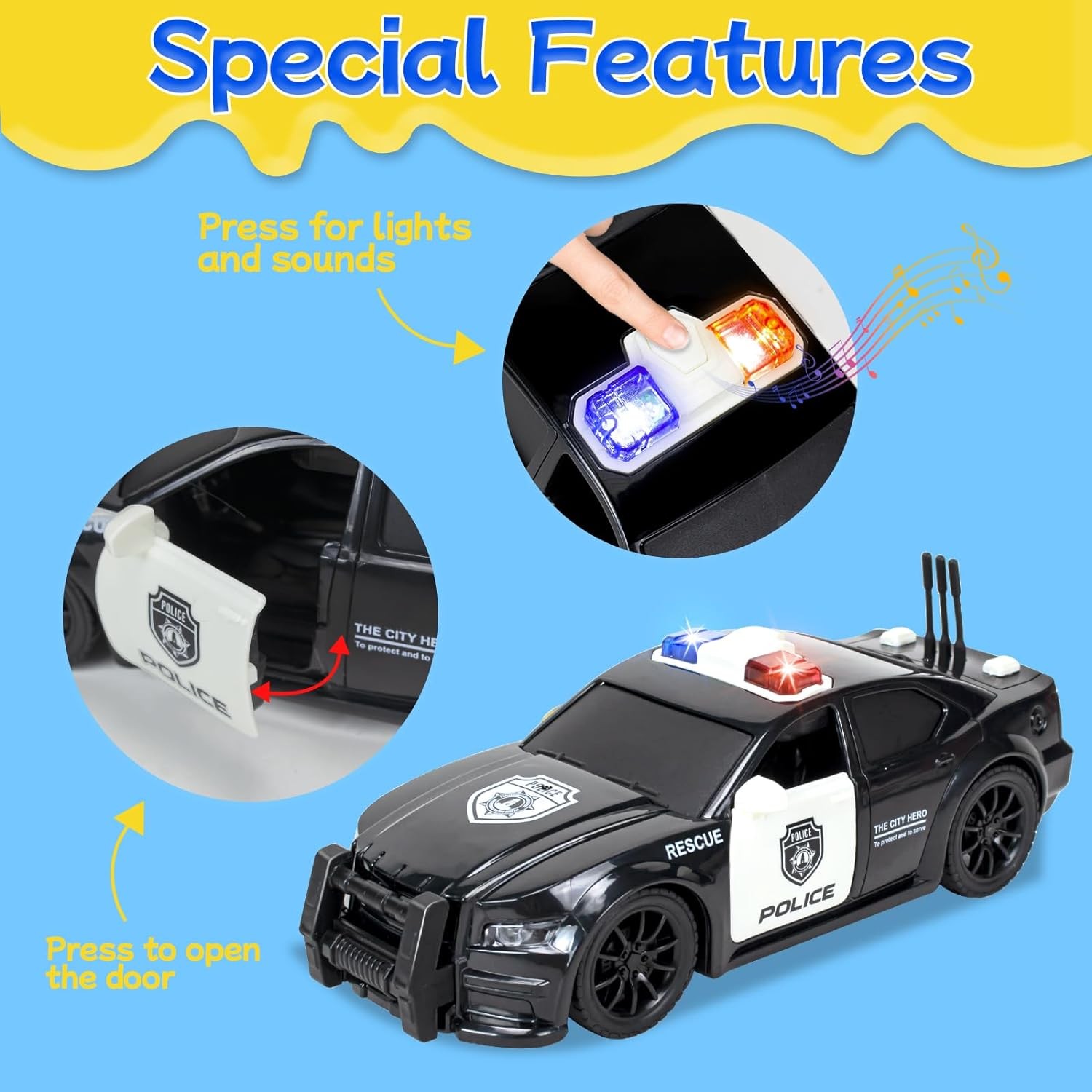 Realistic built-in lights and sounds sirens make these car toy vehicles just like the real thing! Great car toys for kids pretend play!